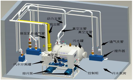 真空排導系統是利用真空廢污水提升器和真空廢污水泵站,將分散排放點的廢污水集中收集,進入真空廢污水罐內,然后輸送至處理站。